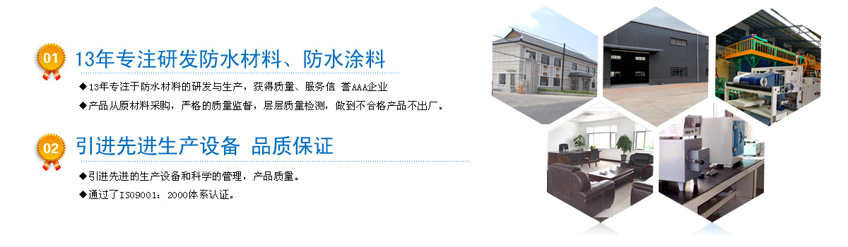 13年專注于防水材料的研發(fā),獲得工業(yè)產(chǎn)品生產(chǎn)許可企業(yè); 嚴(yán)格按照IS09001質(zhì)量管理體系標(biāo)準(zhǔn)進(jìn)行管理......